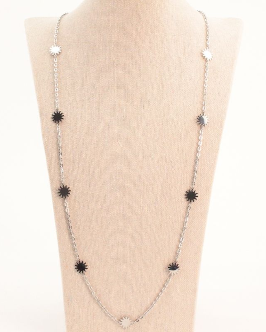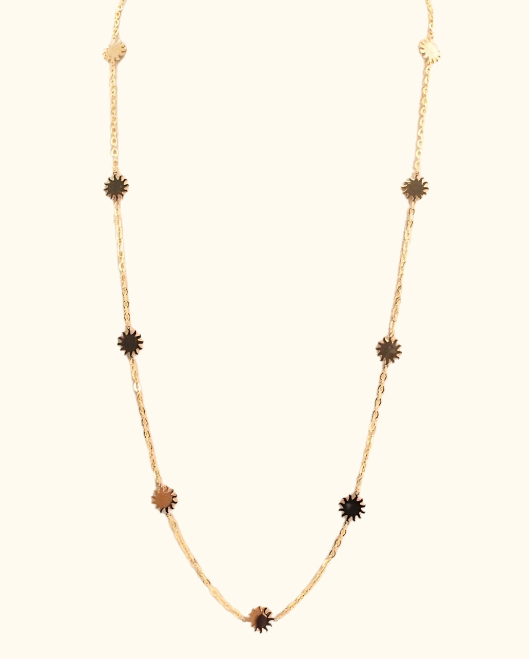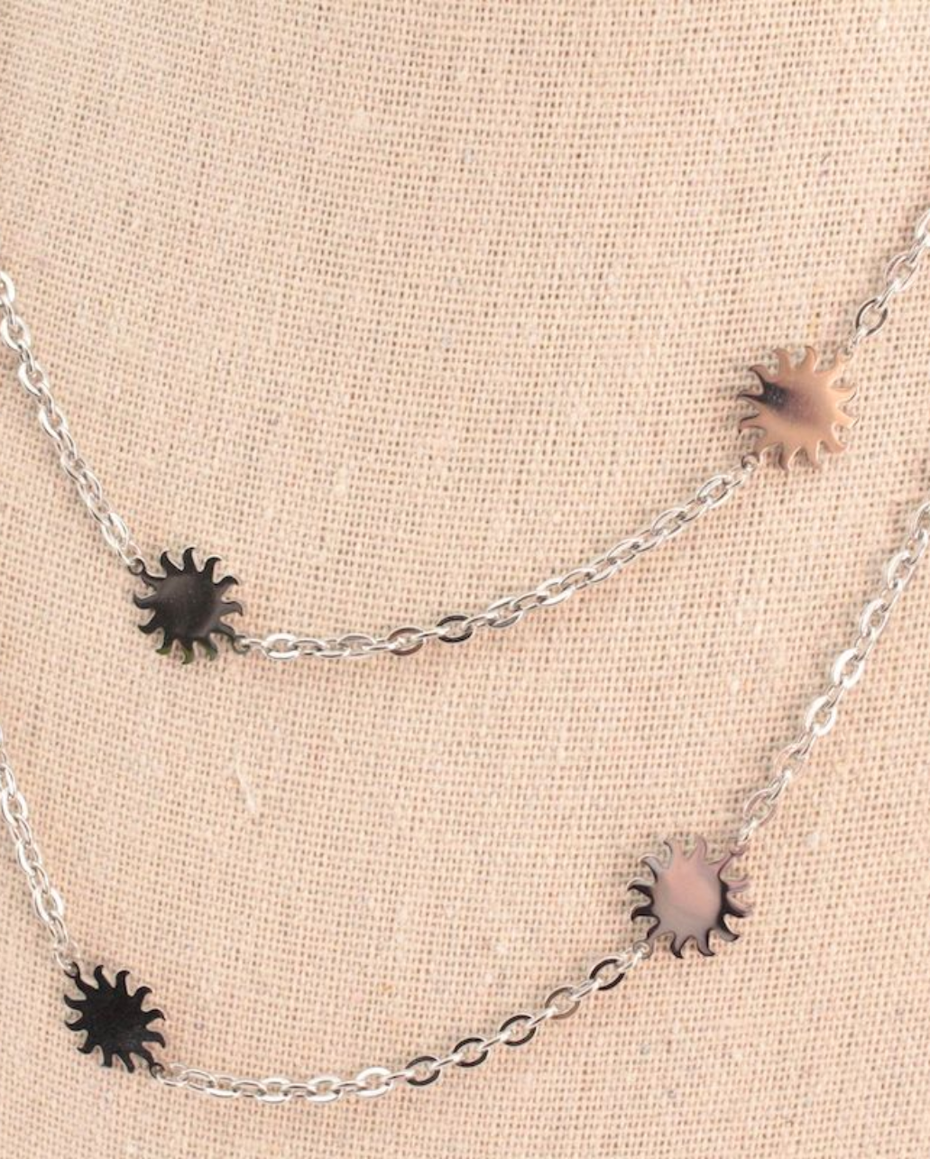 Este collar está hecho completamente de acero inoxidable, lo que lo hace duradero y resistente al desgaste. El diseño de nuestro collar Multiple Suns es versátil y elegante lo hace ideal para cualquier ocasión, desde un look casual hasta una noche especial. No te pierdas la oportunidad de añadirlo a tu colección de accesorios.